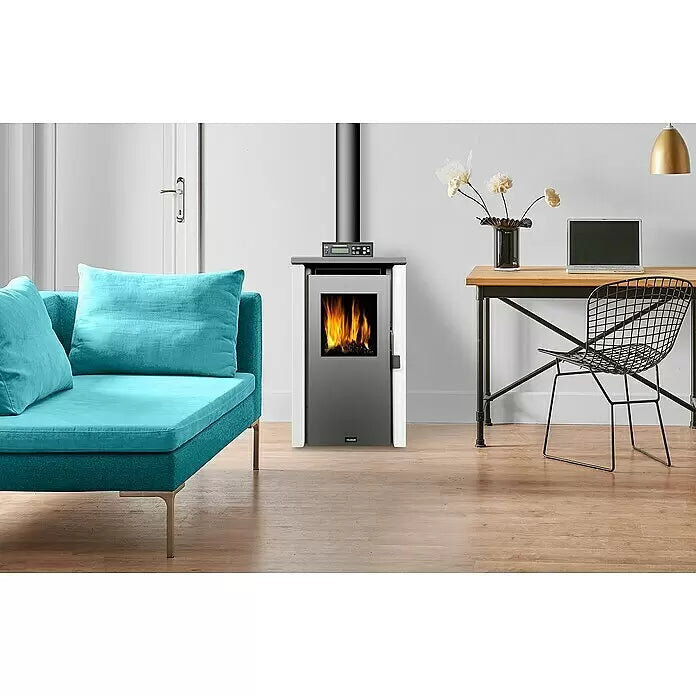 La estufa de pellets Lake 7 destaca por ser un medio de calefacción limpio y económico. El modelo de aire es ecológico y eficiente, ya que reparte el calor por la estancia en la que se encuentra. Su combustible es el pellet, un material totalmente renovable fabricado a partir de residuos vegetales, con un alto poder calorífico y bajas emisiones de CO2. Dispone de un panel de control con pantalla LCD muy intuitivo y fácil de usar. Además, cuenta con encendido piezoeléctrico. Su instalación requiere salida de humos y enchufe. Se recomienda empezar la instalación de evacuación de humos con una T con registro para facilitar su limpieza.