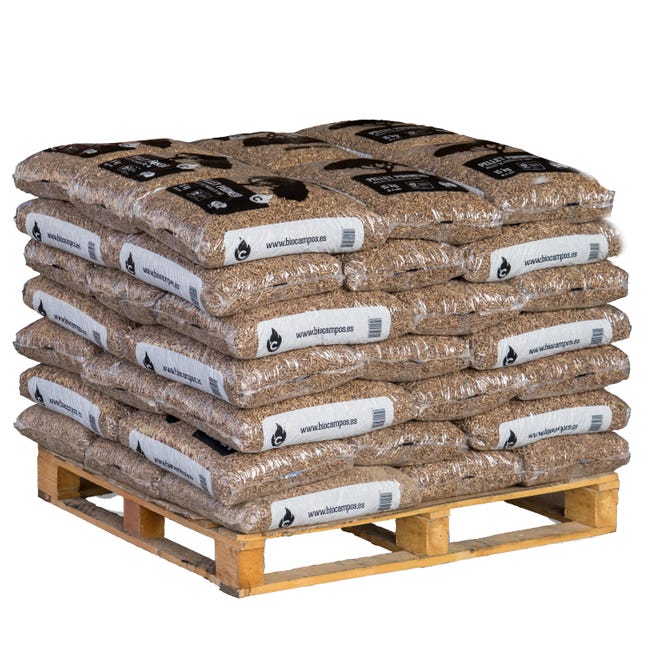 Palé con 42 sacos de pellet de 15 kg cada uno, combustible natural que genera un alto poder calorífico con muy bajos niveles de CO₂, lo que contribuye a reducir las emisiones de gases perjudiciales a la atmósfera. Además, no produce olores por lo que proporciona un calor ecológico, limpio y seguro. Contenido: 630 kg.